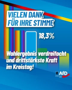 Durch Ihre Stimme und Ihren Einsatz haben wir unser Ergebnis im Märkischen Kreis mehr als verdreifacht – von vormals 5,7 % auf 18,3 %. Damit sind wir nun drittstärkste Kraft im Kreistag.