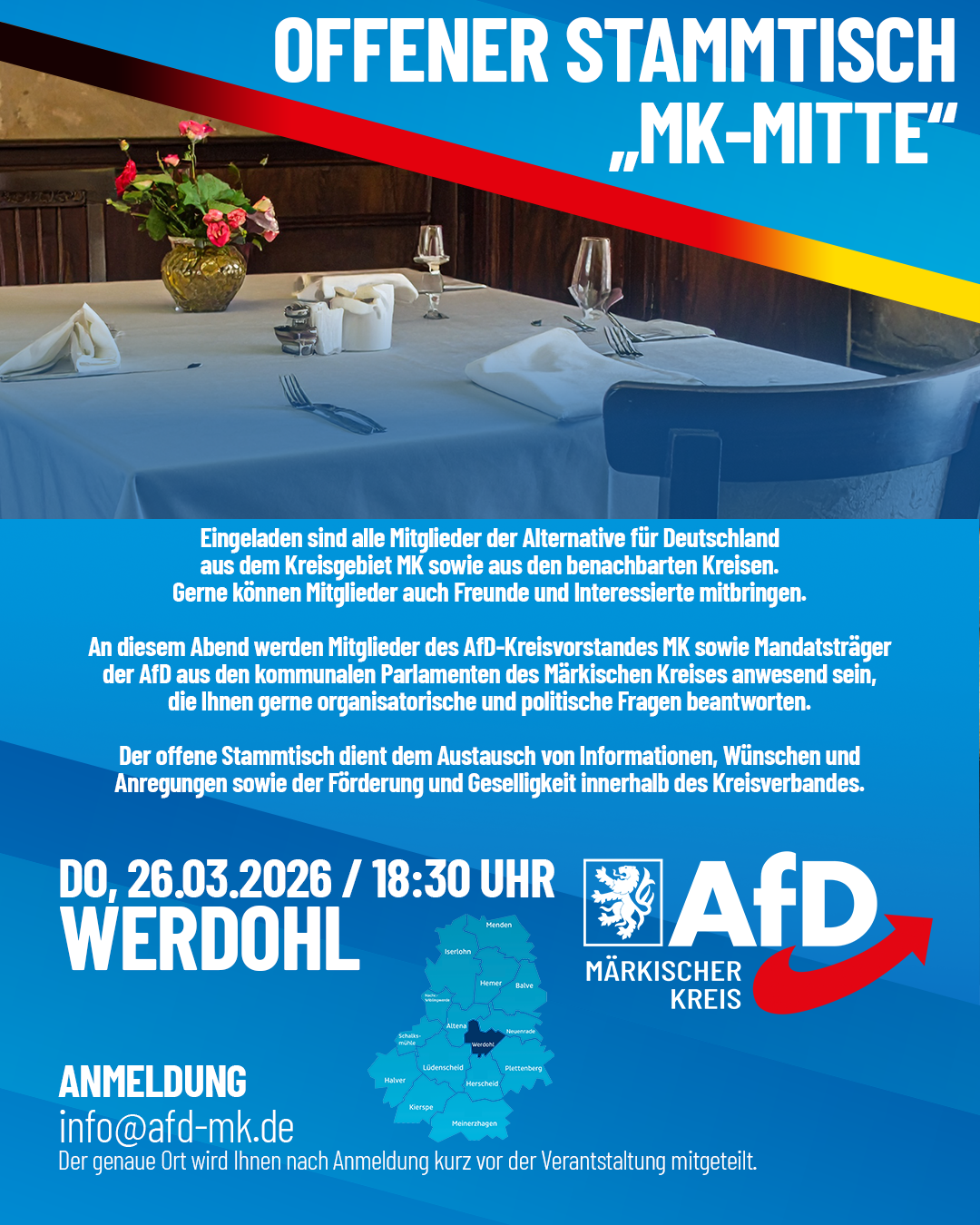 Alle Informationen zu unserem 1. offenen Stammtisch am 26.03.2026 in Werdohl (MK-Mitte) finden Sie auf der beigefügten Kachel.