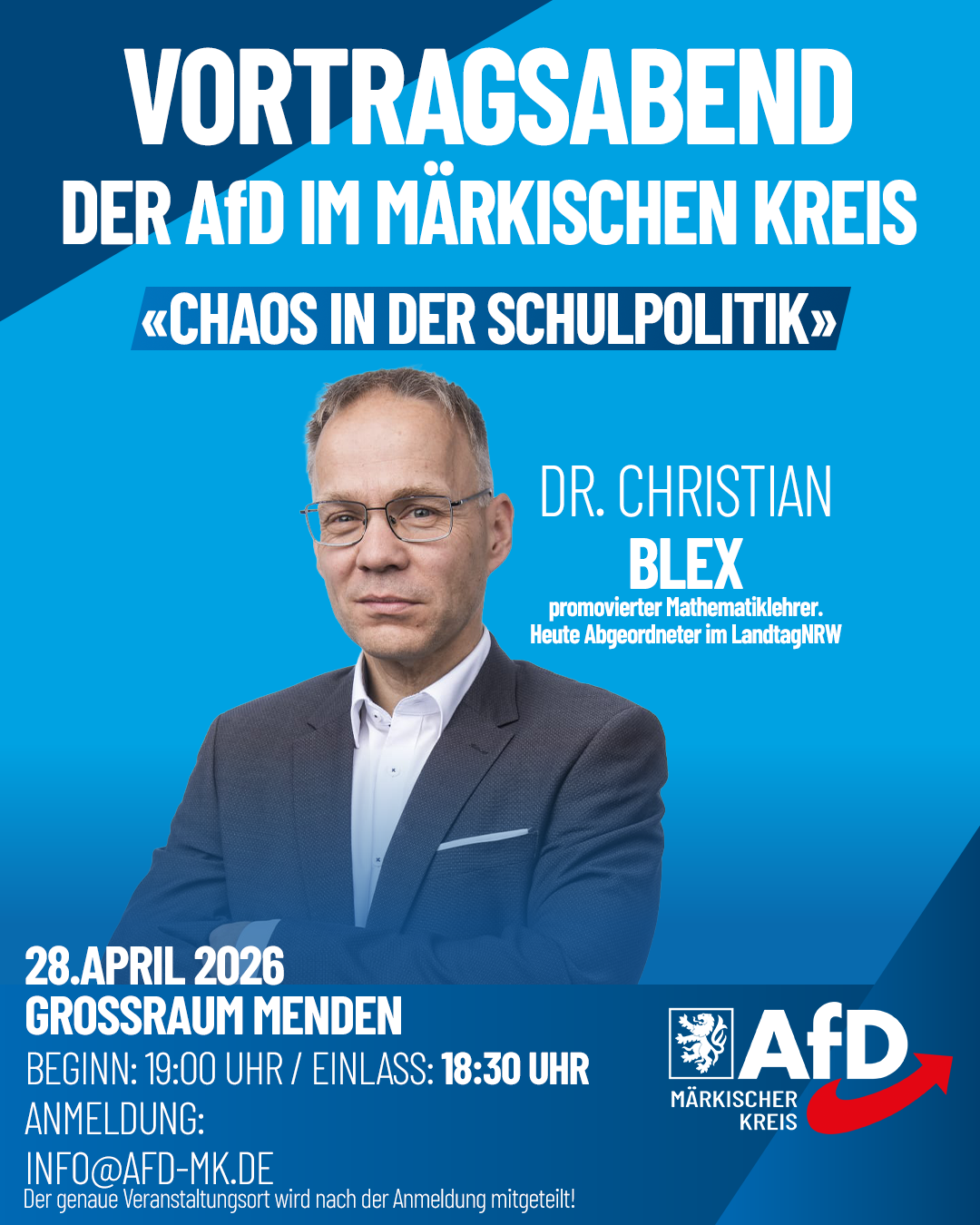 Hiermit laden wir Sie herzlich zu unserem Vortragsabend mit Dr. Christian Blex im Großraum Menden ein. Thema des Abends ist „Chaos in der Schulpolitik“.